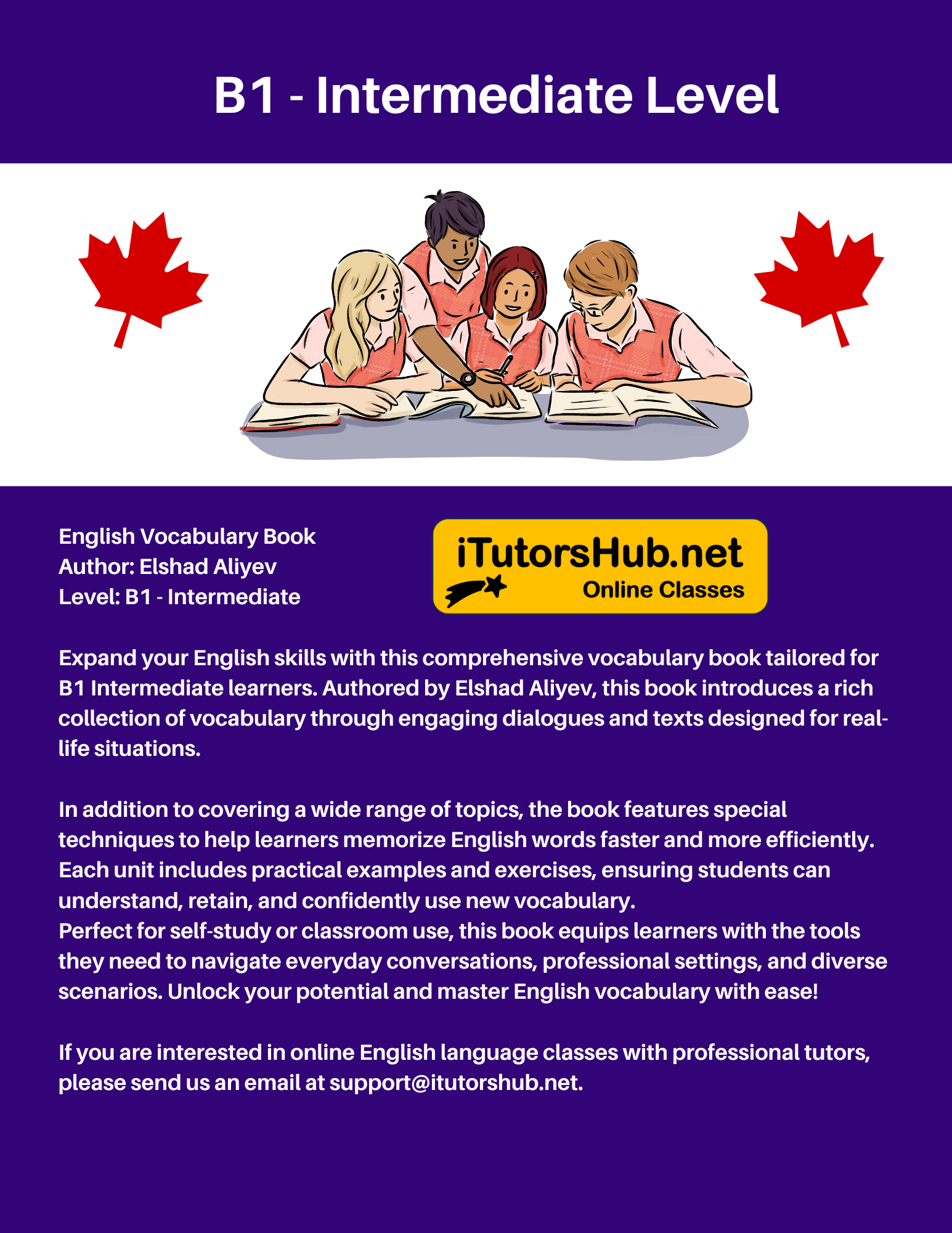 Expand your English skills with this comprehensive vocabulary book tailored for B1 Intermediate learners. Authored by Elshad Aliyev, this book introduces a rich collection of vocabulary through engaging dialogues and texts designed for real-life situations.